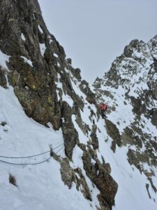 Dans la traversée du 1er gendarme, l’alpiniste utilise tantôt les bandes de neige, tantôt le rocher Fin novembre, dans le cadre du stage d’alpinisme, nous