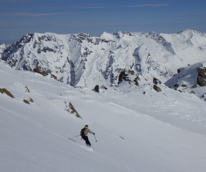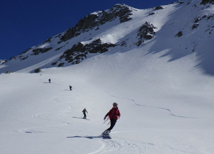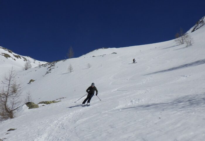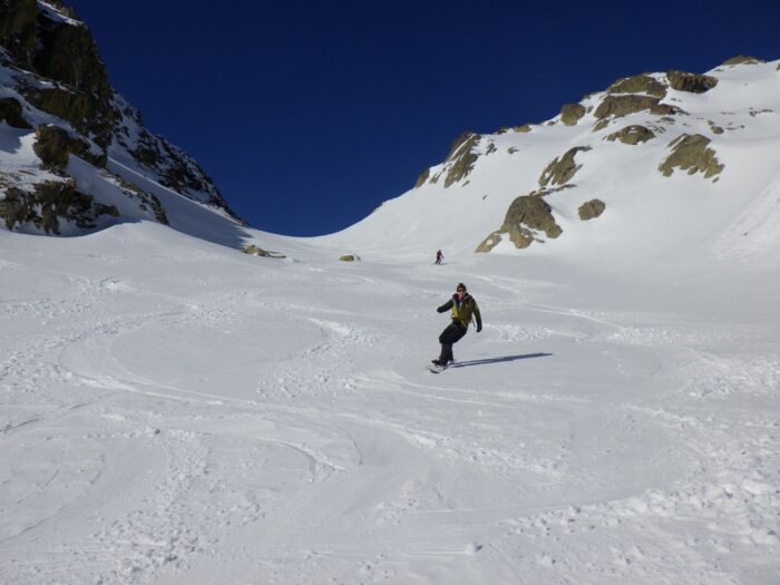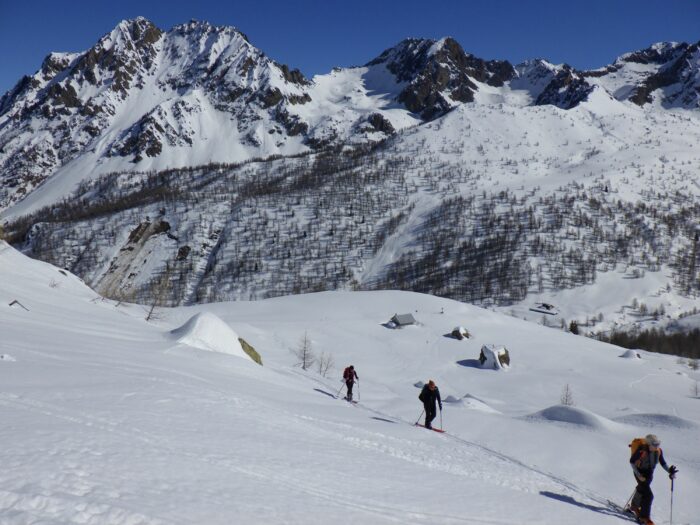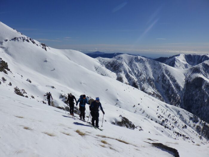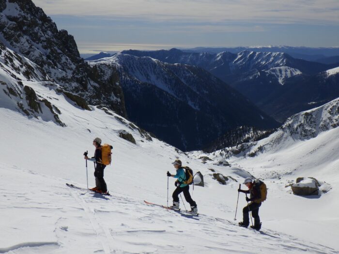 Pour la suite de l’itinéraire, Baptiste et Raphael choisissent de réduire la longueur de leur encordement en faisant des anneaux de bustes. Ils utilisent alors les modes de progression 1 et 2 et jouent avec le terrain pour s’assurer !
