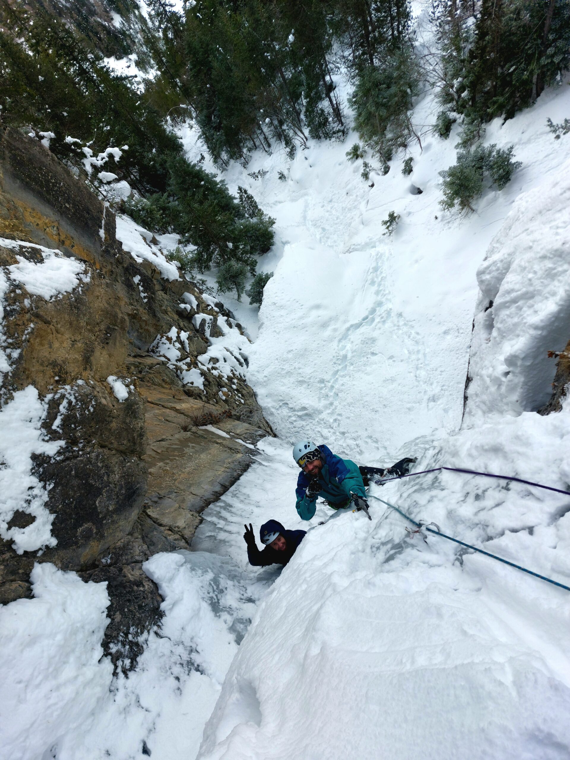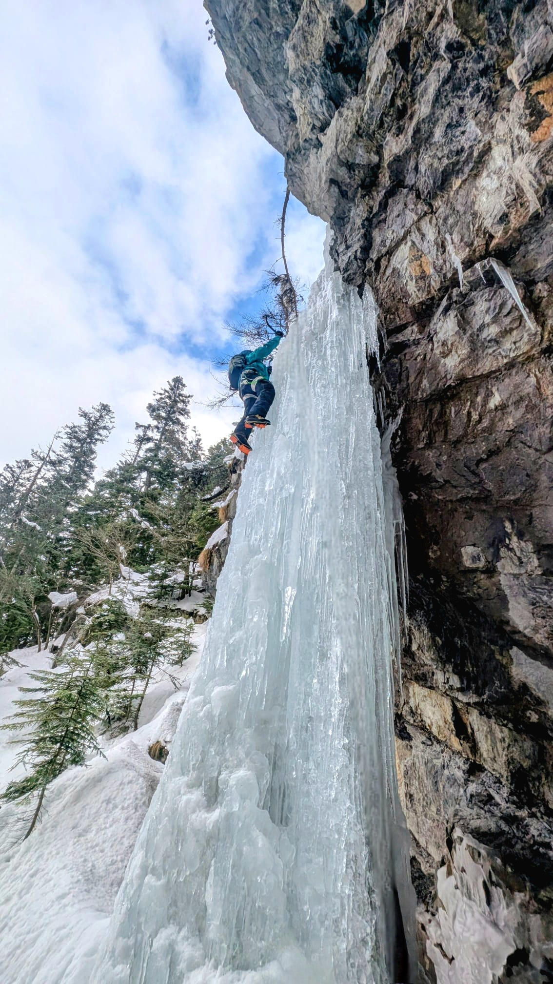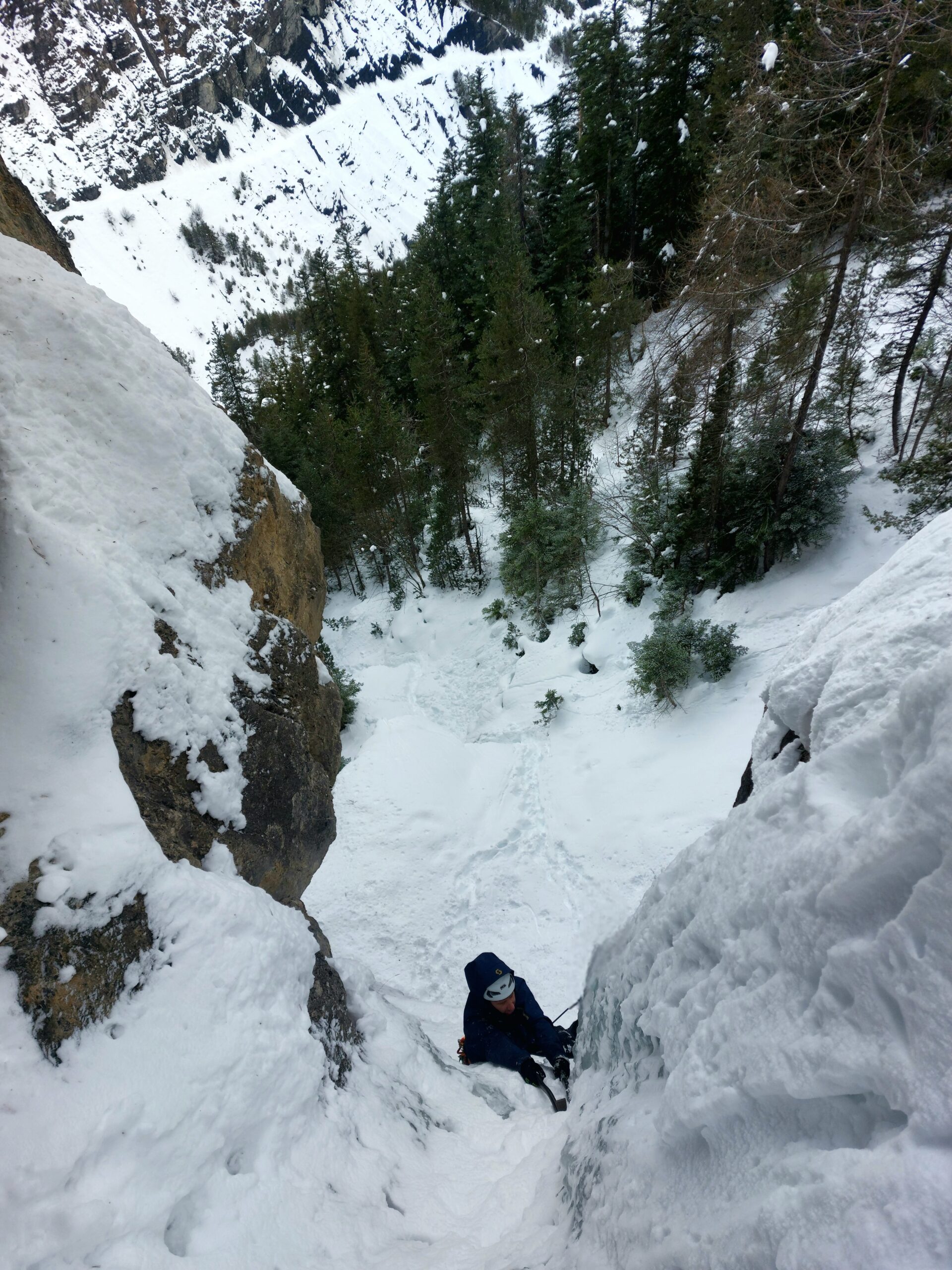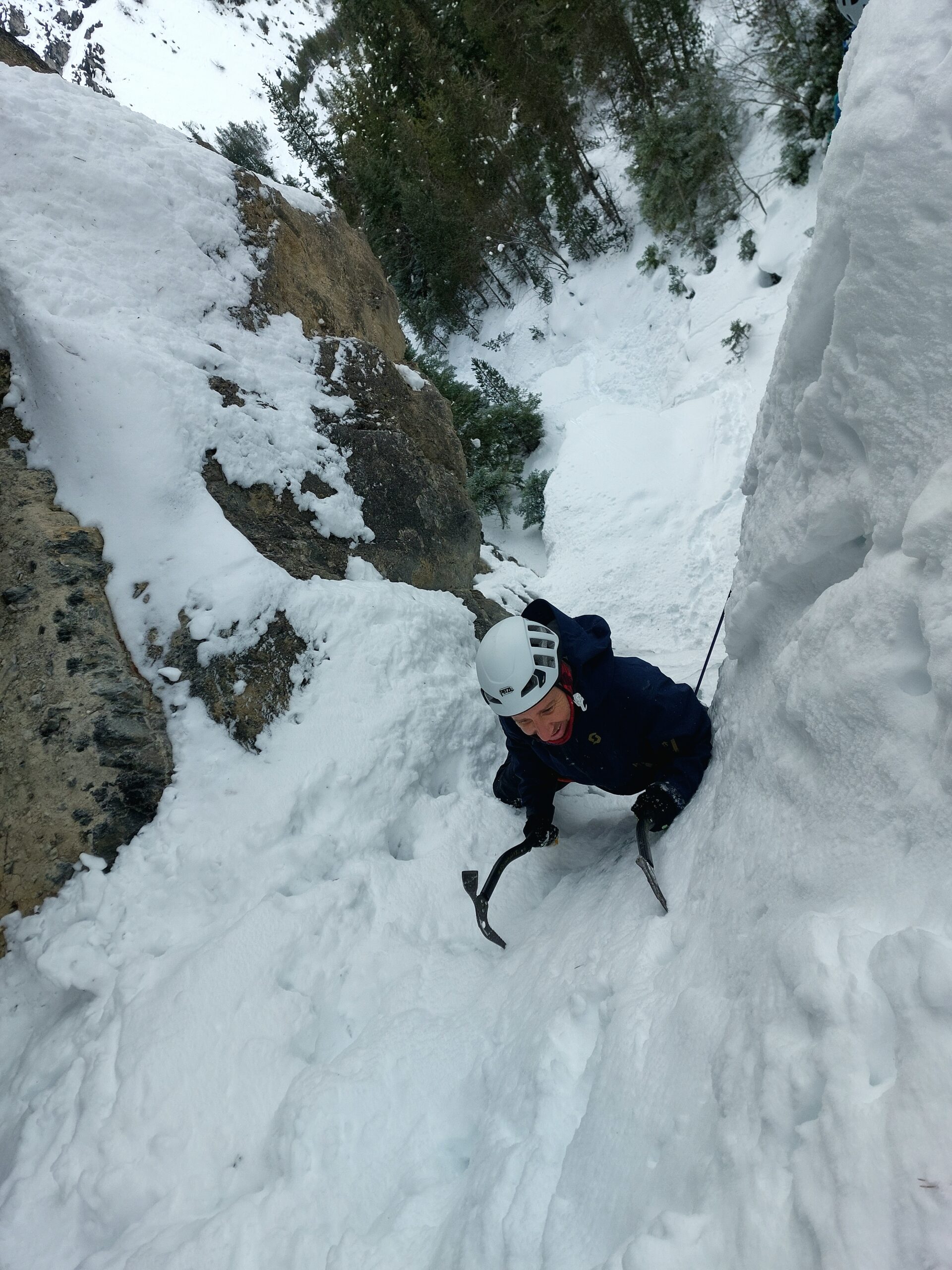 La quatrième et dernière longueur est un peu plus longue que les autres. Elle permet de terminer cette ascension d’une belle façon, le long d’une sorte de toboggan gelé :
