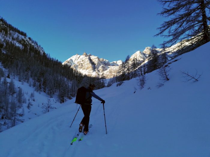 Au terme de la piste, un joli mélézin bucolique nous dépose au pied du couloir, 1h30 environ après notre départ :