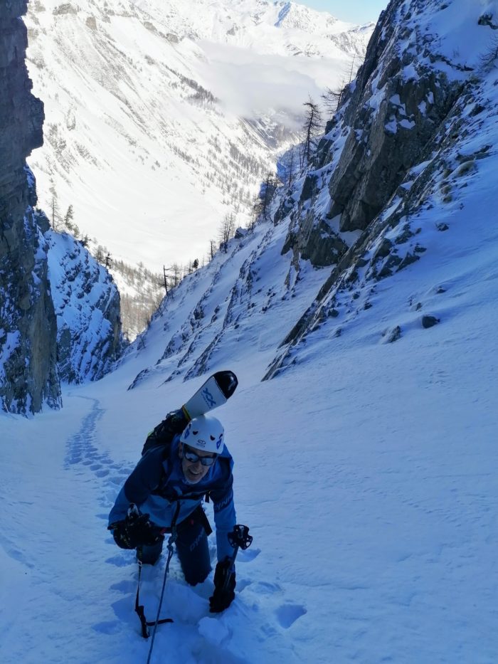 La neige est bonne. Elle nous permet de remonter la partie inférieure du couloir Nord-Est à ski. Un nombre non négligeable de conversions sera tout de même nécessaire :