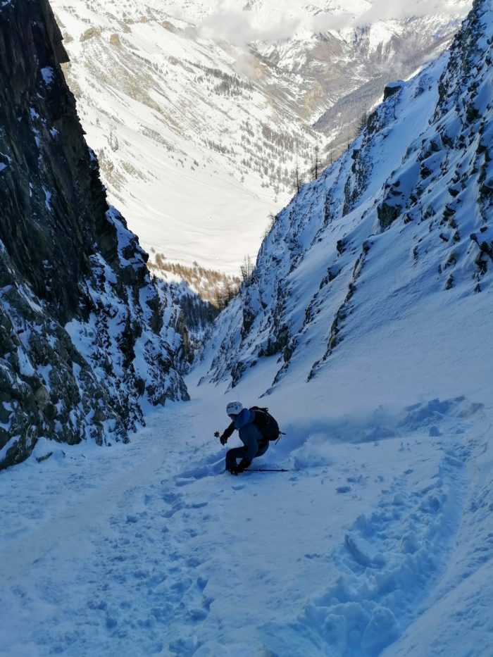 Après cet agréable bain de soleil, le temps tant attendu de la descente est venu. Nous replongeons skis aux pieds dans la froideur du couloir Nord-Est remonté quelques dizaines de minutes plus tôt :