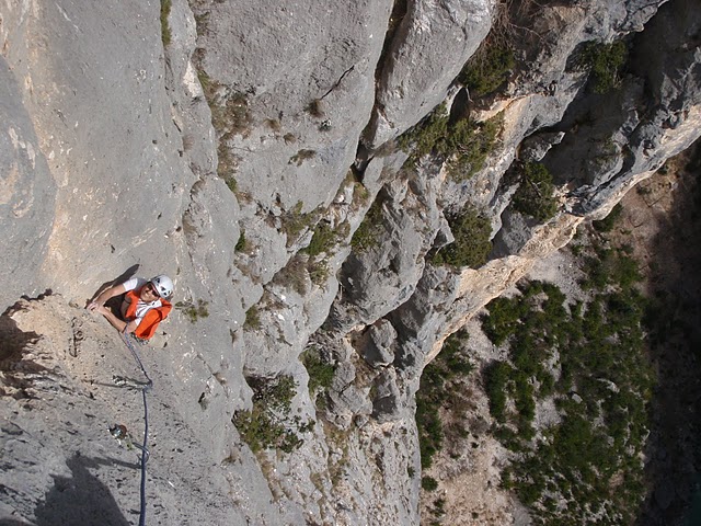 L4, magnifique 6A+ qui suit une fissure dans du rocher excellent, normale nous sommes au Verdon!