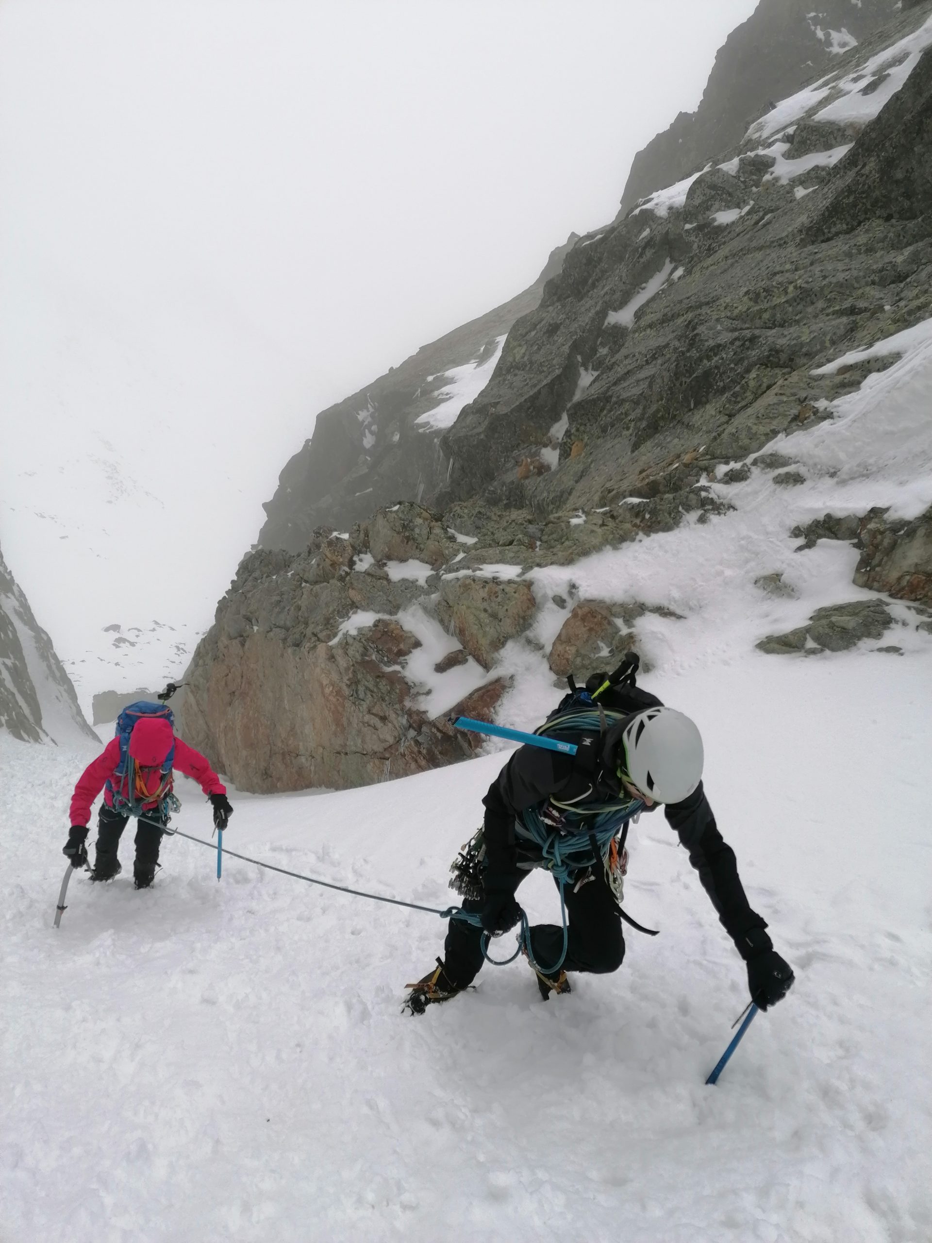 Balàzs et Rèka au col de jonction de ces deux couloirs sur le fil de l’arête du pas du Loup :
