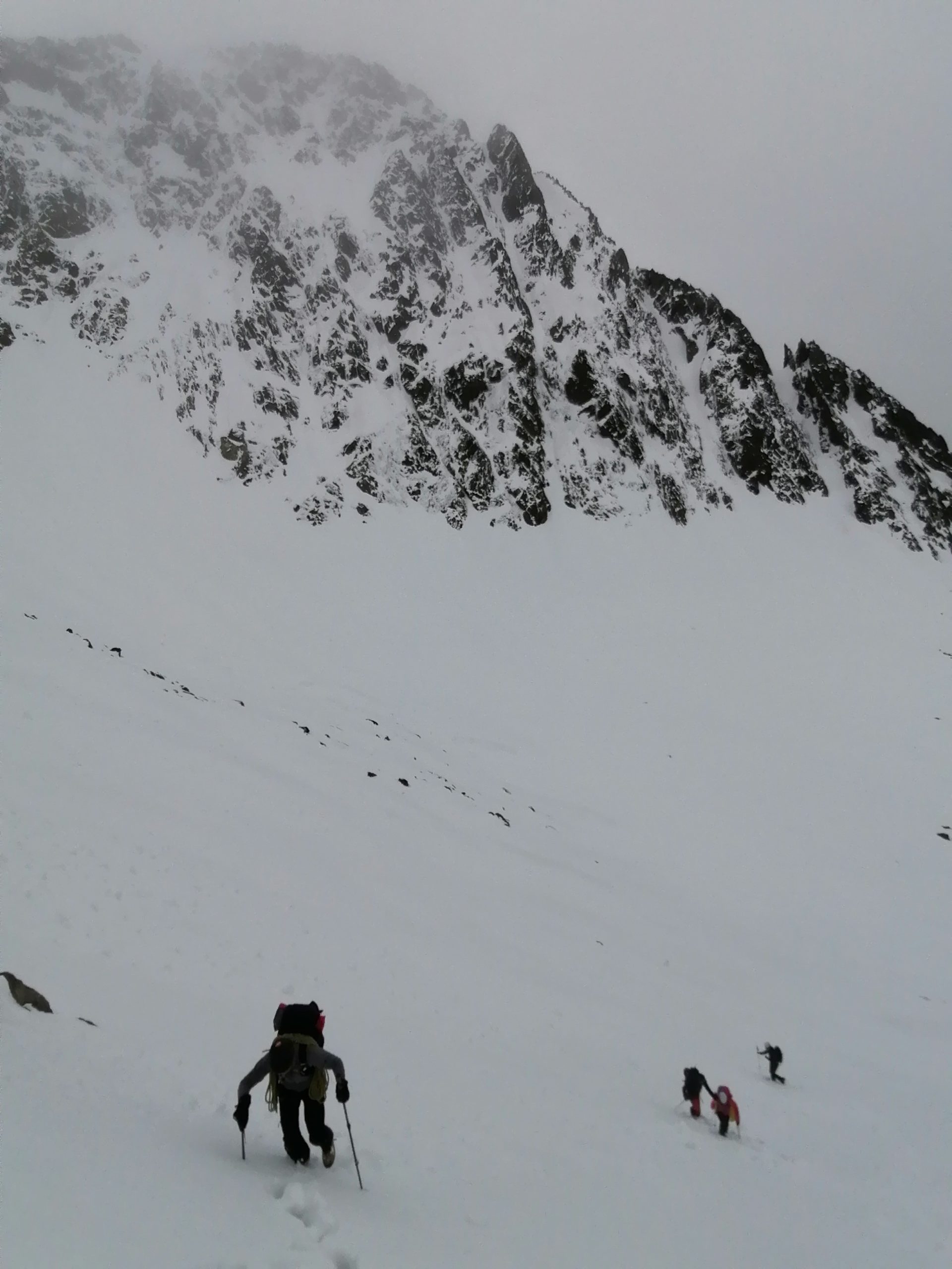 La pente n’est pas trop raide. La neige est sûre. Les premiers de cordée sont solides. Nous progressons anneaux à la main en corde courte et bien tendue :