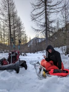 - Adaptation du type d’abri aux conditions de neige et de météo (construction d’abri dans la neige, ou d’abri sous bâche, ou d’un campement à la belle étoile),