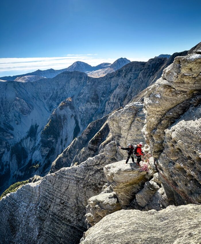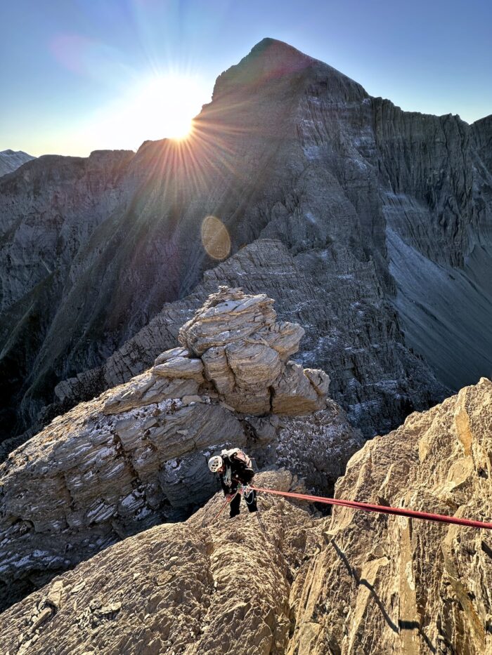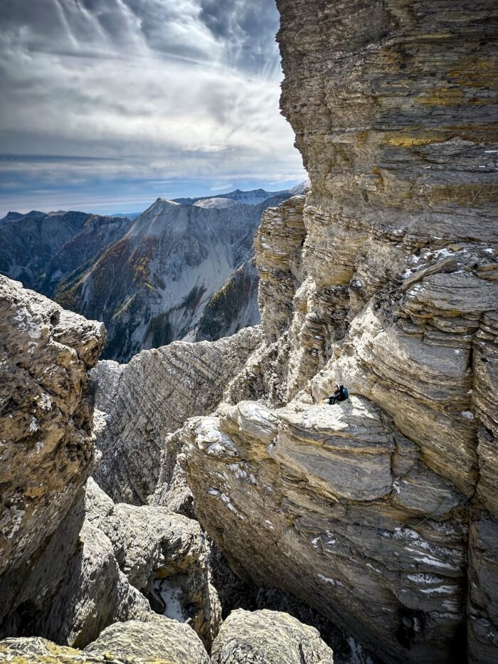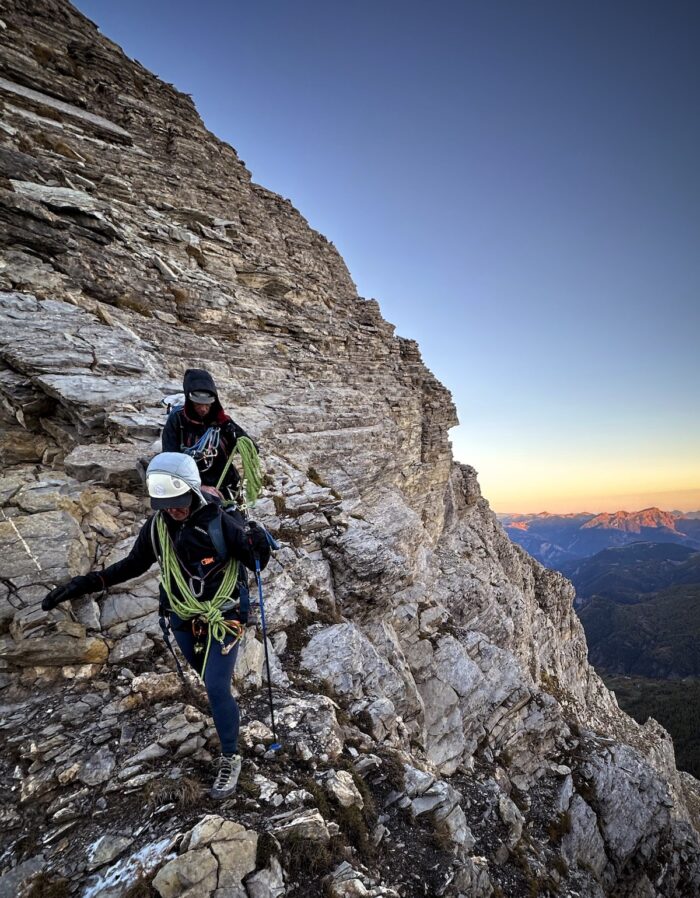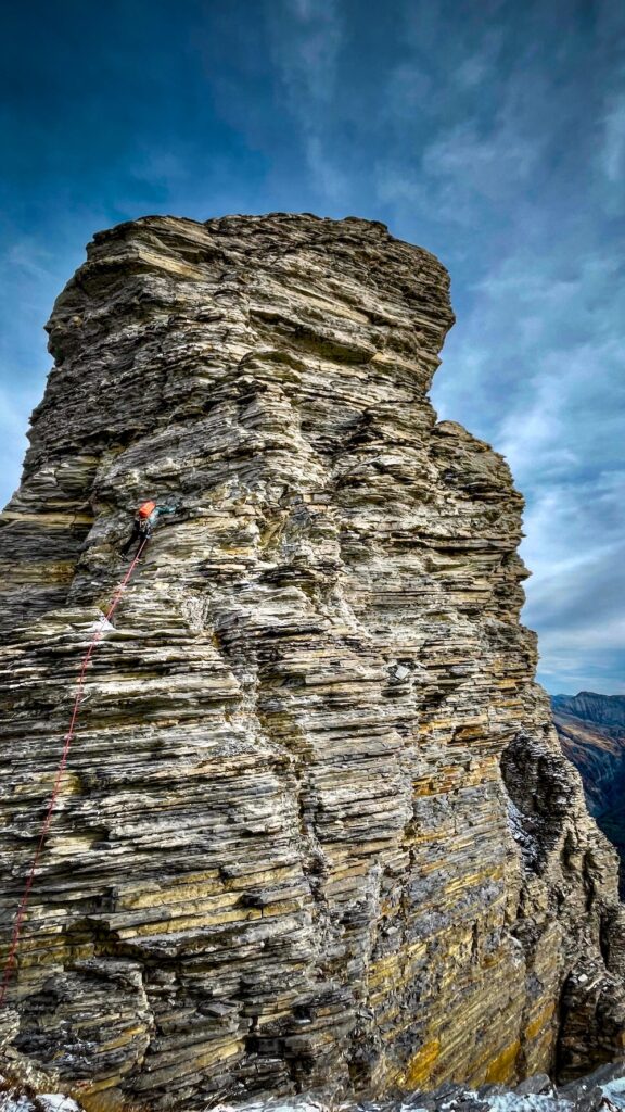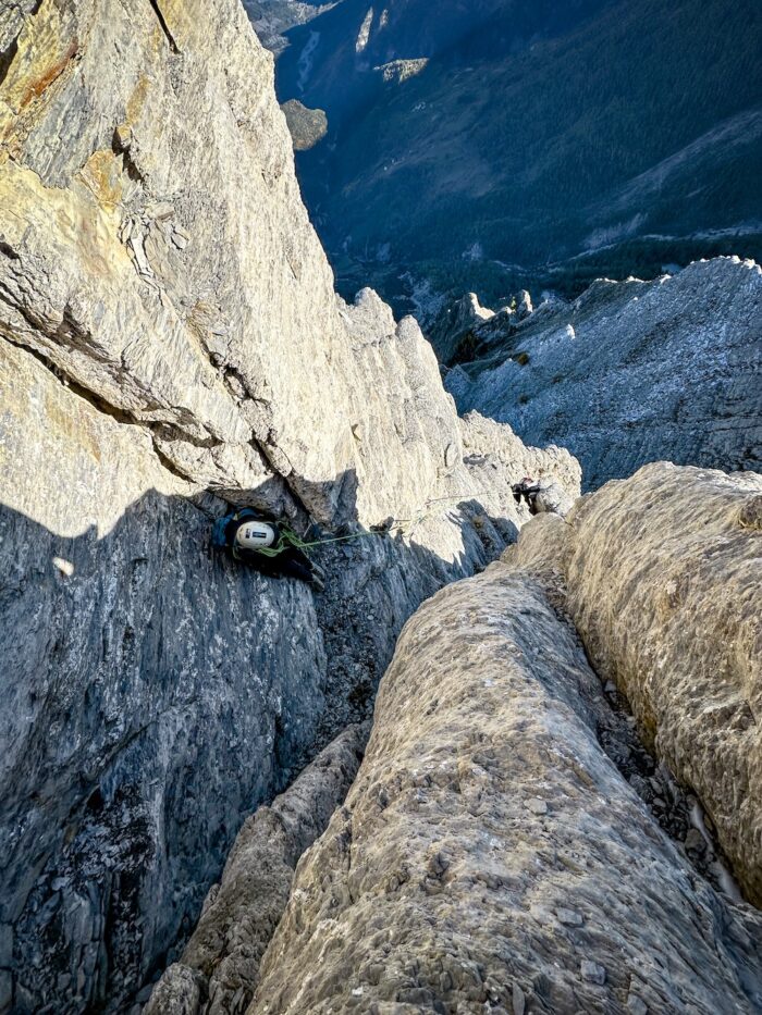 Puis nous débouchons sur l’épaule : la voie démarre ici, et l’ambiance est immédiatement aérienne. Le rocher exige attention et précision : on est dans le vif du sujet dès les premiers mètres. Rocher parfois évolutif, passages aériens, protections subtiles…