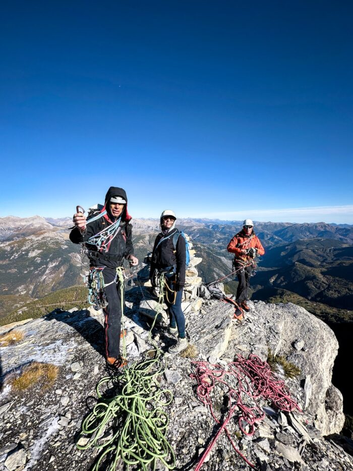 Marc a été bon aujourd’hui : progression à son rythme, protections propres et un sang-froid remarquable. Une belle évolution depuis son premier stage avec Guides06. Marie, sa binôme, profite pleinement de l’ascension, toujours souriante et sans se laisser impressionner. Je fais équipe avec Daniel, qui trouve son rythme peu à peu et enchaîne les longueurs avec détermination.